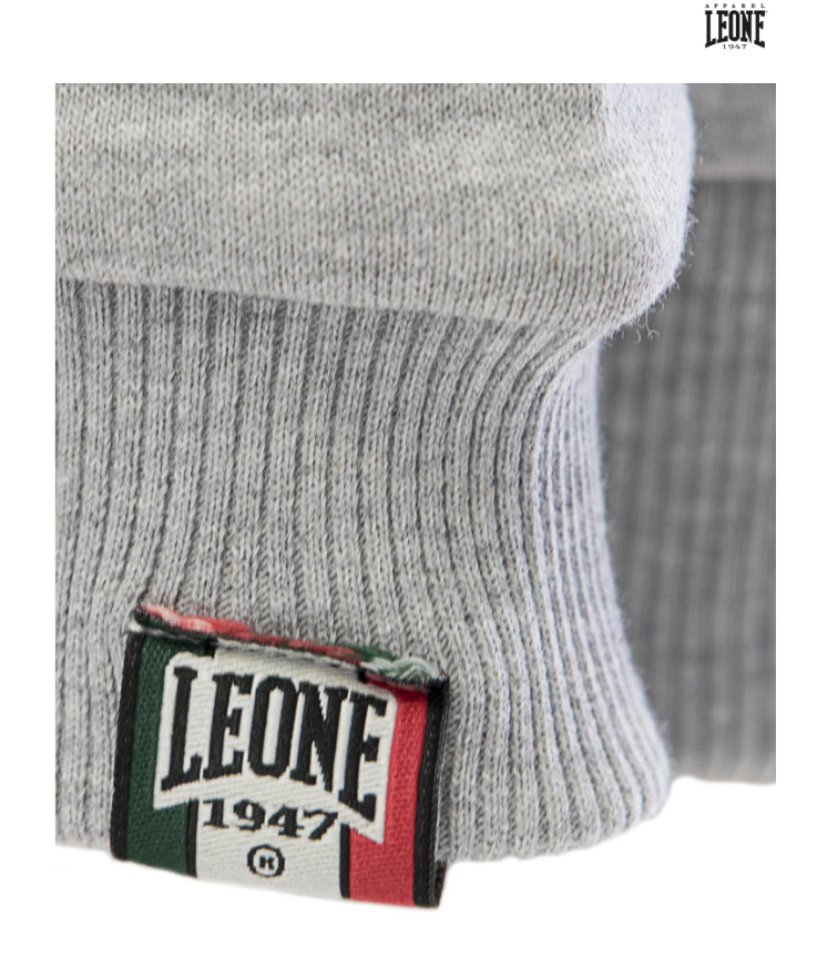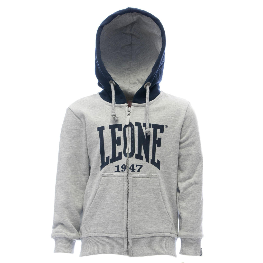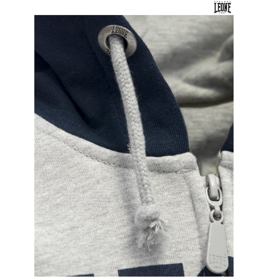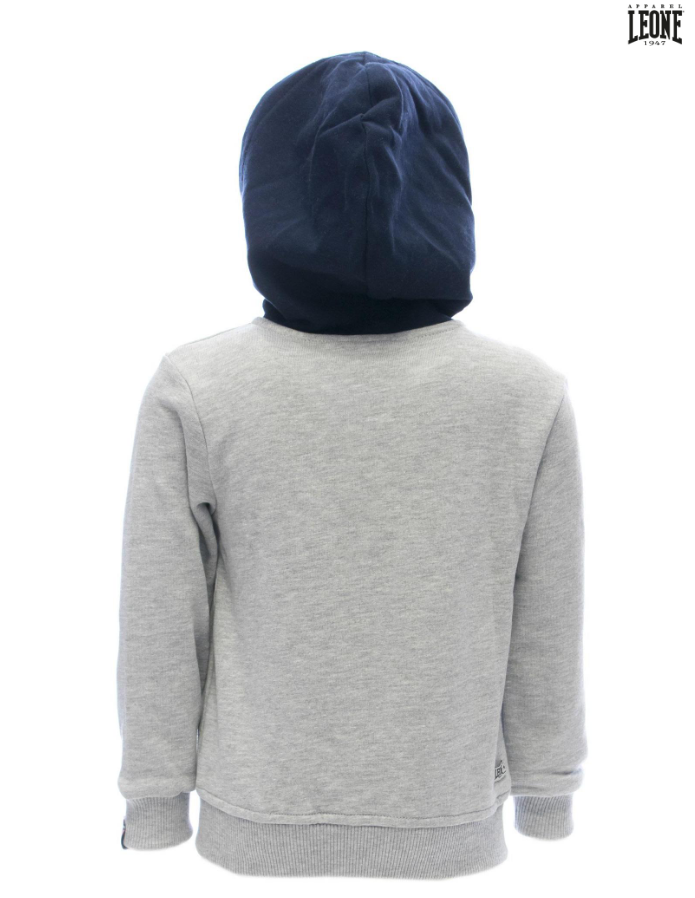 Boy hoody Boy Basic, full zip Brushed fleece, hood in contrast color, hood drawstring with silver eyelets and cord matching color, cuffs and bottom in rib matching color, zip for front matching color Print logo on chest in contrast color, labels Leone 1947 Apparel on inner back neck line, on left cuff and back bottom