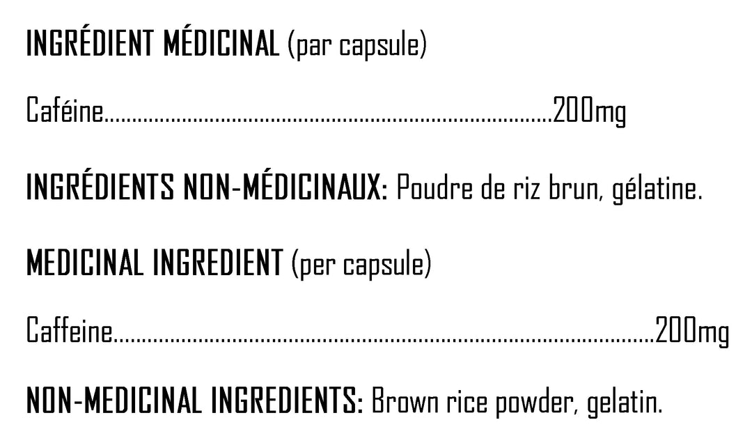 WARNINGS :For occasional use only. Caffeine intake is not advisable in cases of high blood pressure or pregnancy. Not intended for use as a substitute for sleep. The recommended dose of the product contains about as much caffeine as a cup of coffee. Limit the amount of caffeine contained in medication, beverages (coffee, tea, colas) or foods (chocolate), as too much caffeine may cause nervousness, irritability, sleeplessness and occasionnaly, rapid heart rate. Keep out of reach of children.