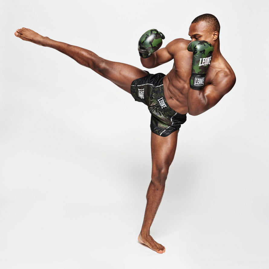 Kick thai shorts in fully camouflage satin, available in two colors: green and gray camo.