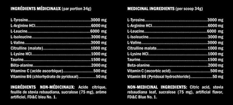 Based on a mixture of L-Arginine, L-Leucine, L-Valine, L-Isoleucine, L-Tyrosine, Beta-Alanine, L-Lysine, L-Citrulline di-malate, L-Taurine, Vitamin B6 and Acid ascorbic acid (Vitamin C).