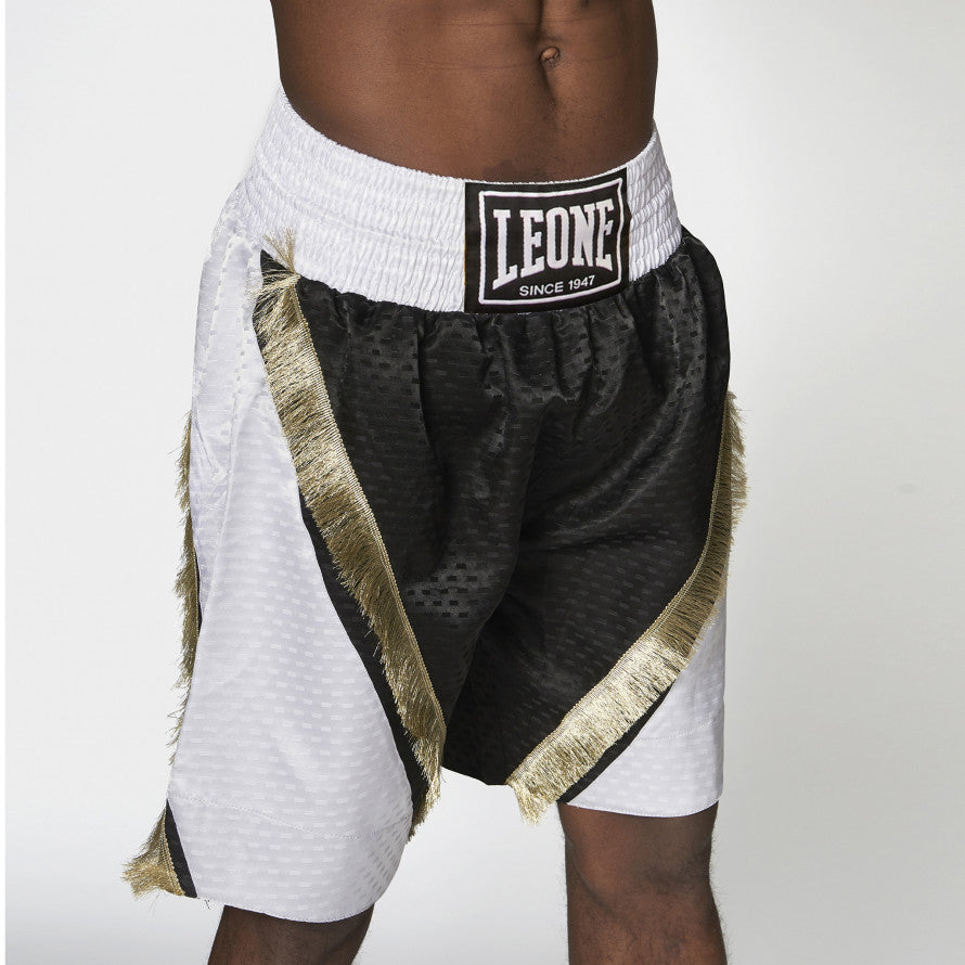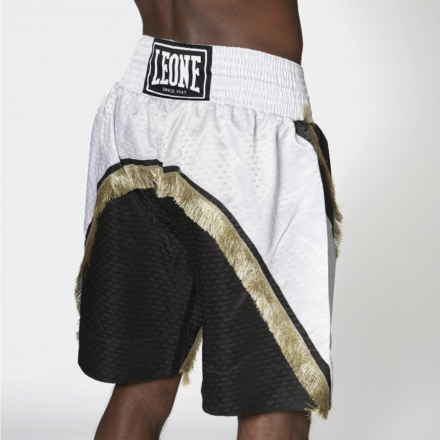 From the legendary American boxing matches comes t”he inspiration forthis special line of professional boxing shorts. The refinement of the fabrics and the metallic finishes enhance these models, making them the ideal garments for major boxing events. The high belt, the side slits and the wide crotch facilitate movements even in the presence of the protective boxing belt.