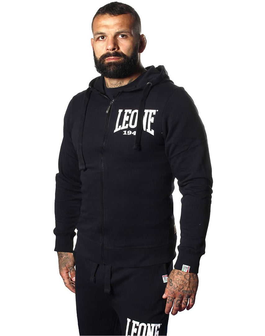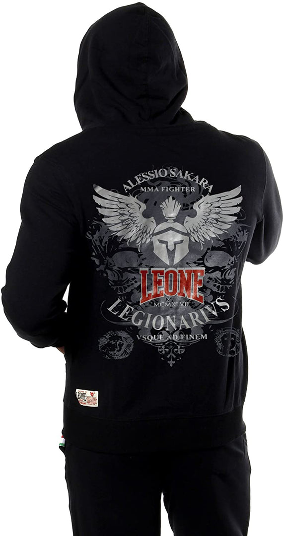 Man hoody Leone 1947 Apparel Legionarivs line with aggressive and strong look, designed for who practice intense combat sports. The hooded sweatshirt his made of unbrushed sweatshirt, 100% cotton, which guarantees fully freedom of movement. The sweatshirt features elastic rib at the bottom and cuffs, a large epic graphic on the bach, the logo Leone 1947 on heart side and a graphic on the hood.