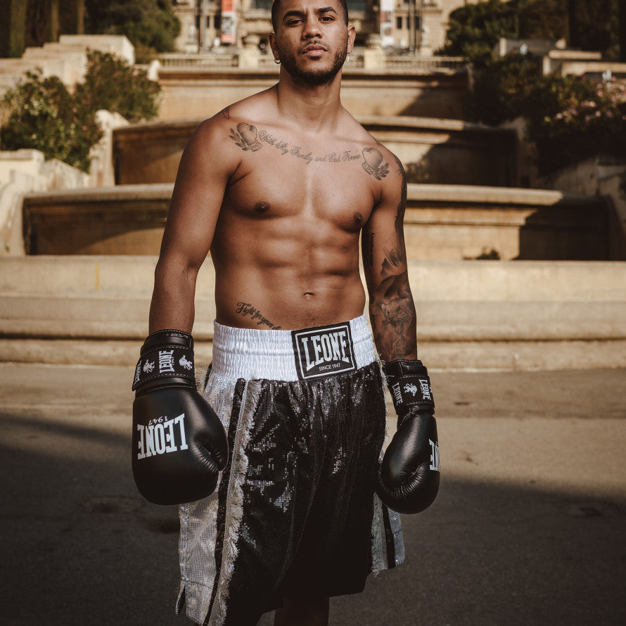 From the legendary American boxing matches comes the inspiration for this special line of professional boxing shorts. The refinement of the fabrics and the metallic finishes enhance these models, making them the ideal garments for major boxing events. The high belt, the side slits and the wide crotch facilitate movements even in the presence of the protective boxing belt.