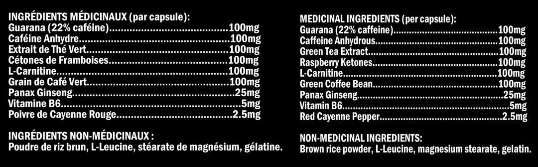 WARNINGS :Consult a health care practitioner prior to use if you are breastfeeding, if you are taking lithium, if you are taking antidepressant medications, if you are taking blood thinners or digoxin, if you have diabetes, if you have stomach ulcers or inflammation, if you have high blood pressure, glaucoma, and/or detrusor instability (overactive bladder syndrome), if you have a liver disorder or develop symptoms of liver trouble (such as abdominal pain, dark urine or jaundice), if you have an iron deficiency, if symptoms persist or worsen. Consumption with natural health products (e.g. bitter orange extract, synephrine, octopamine, ephedra) or other drugs (e.g. ephedrine) which increase blood pressure is not recommended. Consumption with other caffeine-containing products (e.g. medications, coffee, tea, colas, cocoa, guarana, maté) is not recommended. This product is not intended as a substitute for sleep. Feelings of sleeplessness or overstimulation may occur; discontinue use if feelings persist or worsen.